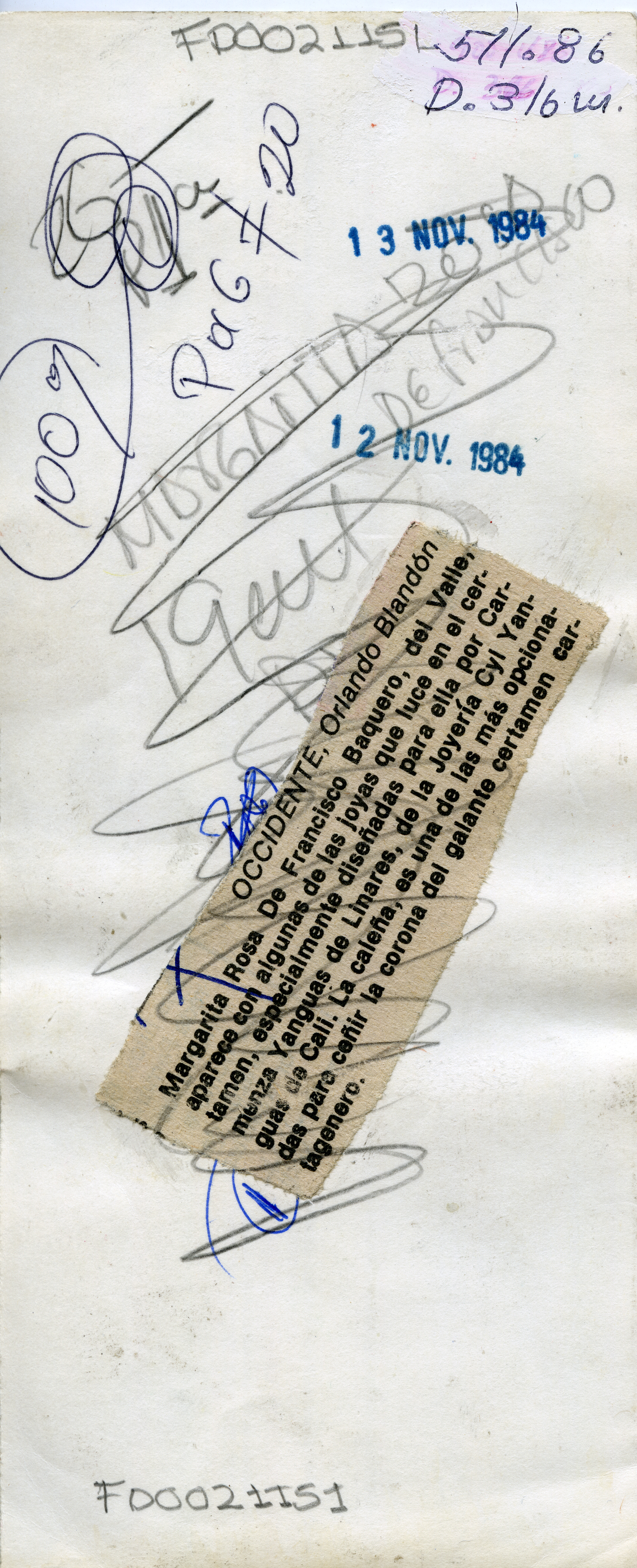 Reverso: Margarita Rora De Francisco Baquero, del Valle, aparece con algunas de las joyas que lucen en el certamen, especialmente diseñadas para ella por Carmenza Yanguas de Linares, de la joyería Cyl Yanguas de Cali. La caleña, es una de las más opcionadas para ceñir la corona del ganate certamen cartagenero