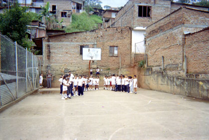 Grupo escolar en escenario deportivo, segundo plano. Exterior día. Barrio de ladera en franja superior de escena. Sobresale textura en relieves de casas.