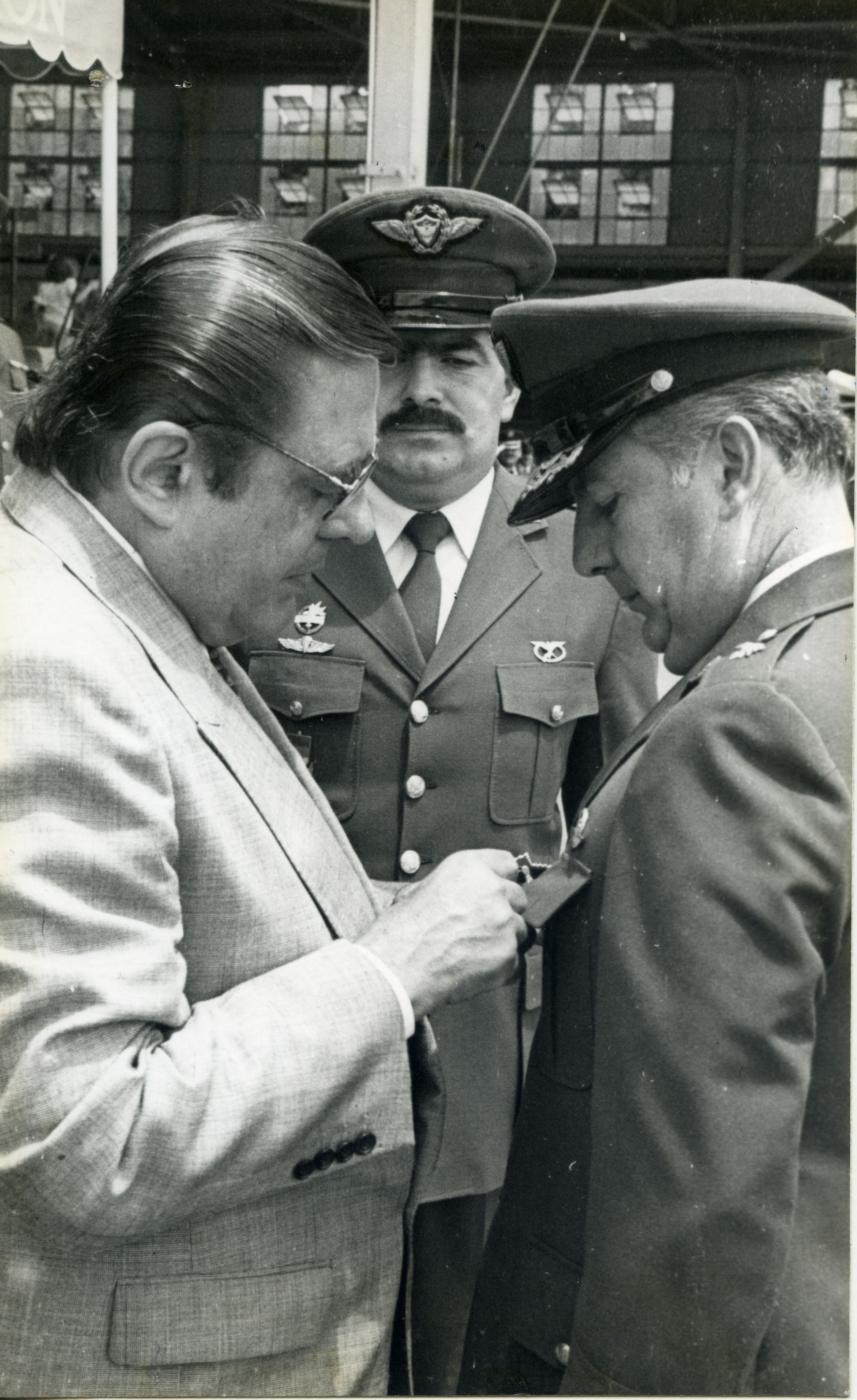 Fotografia de plano medio largo del Gobernador del Valle Ernesto Gonzalez Caicedo condecorando al Brigadier General Alfonso Albondano Alzamora