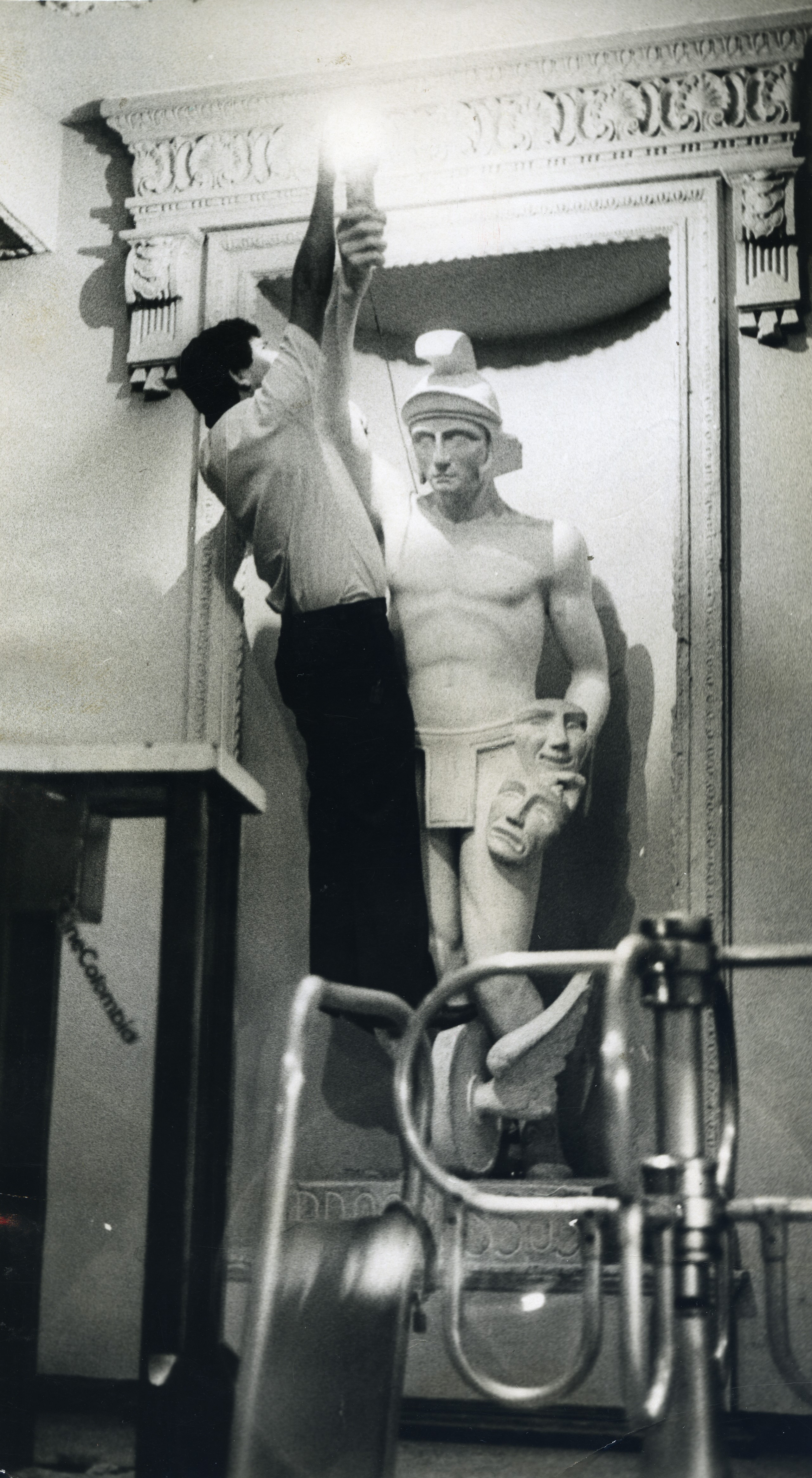 Al reverso de la fotografía se anexa el recorte: "El administrador del teatro enciende la lámpara de la escultura que representa El Progreso. Forma simbólica de mostrar la nueva época de Isaacs, listo en diciembre de 1987."