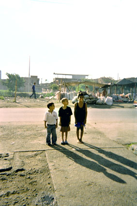 Tres niños de pie cuya sombra se proyecta sobre la acera. Al fondo una vía y algunas edificaciones. Plano medio.