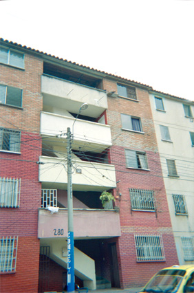 Plano general. Fachada de edificio de apartamentos. En el plano medio poste de luz y tendido eléctrico irrumpiendo el campo visual. Exterior día.