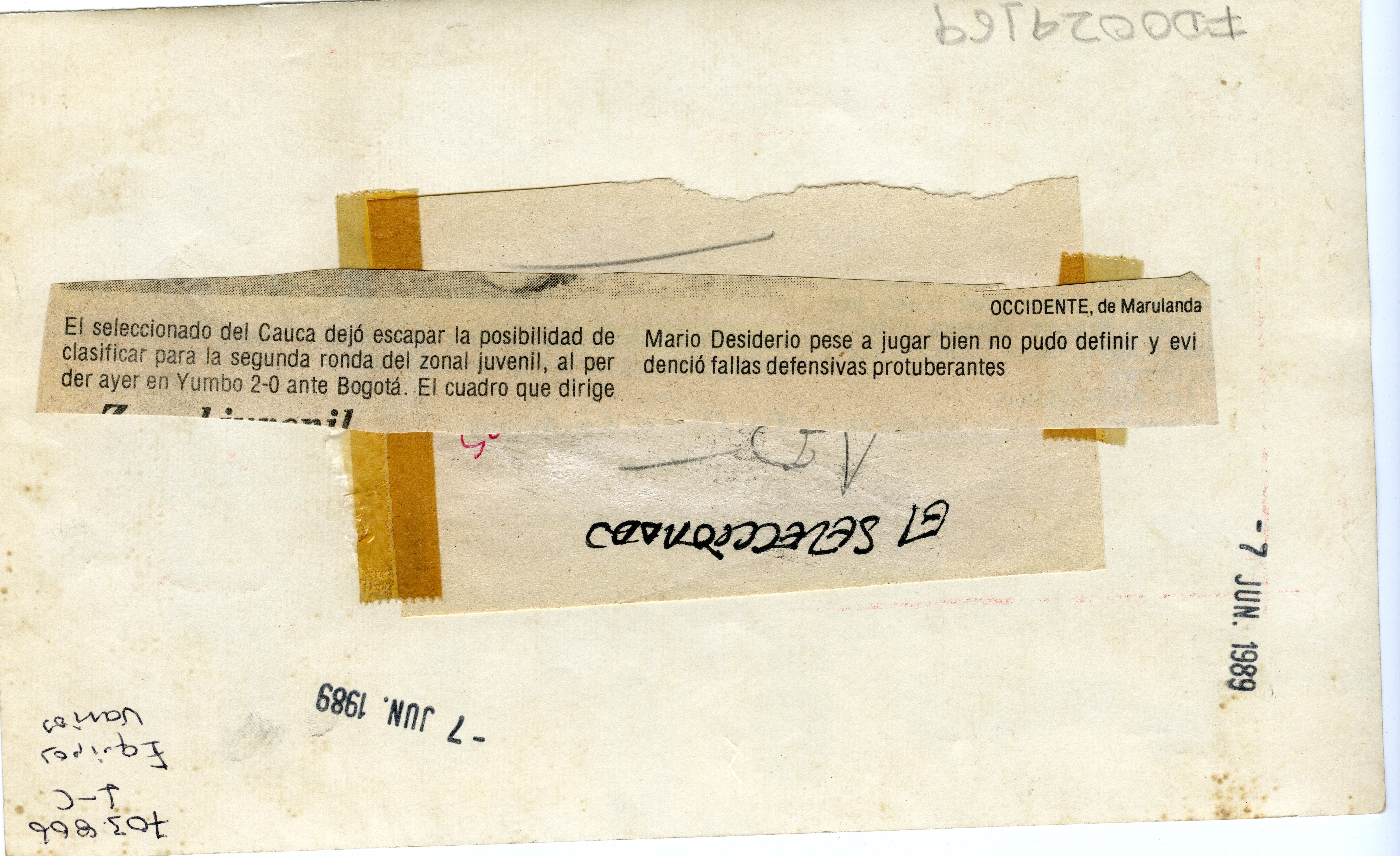 Al reverso de la fotografía se anexa recorte:El seleccionado del Cauca dejó escapar la posibilidad de clasificar para la segunda ronda del zonal juvenil al perder ayer en Yumbo 2-0 ante Bogotá. El cuadro que dirige Mario Desiderio pese a jugar bien no pudo definir y evidenció fallas defensivas protuberantes