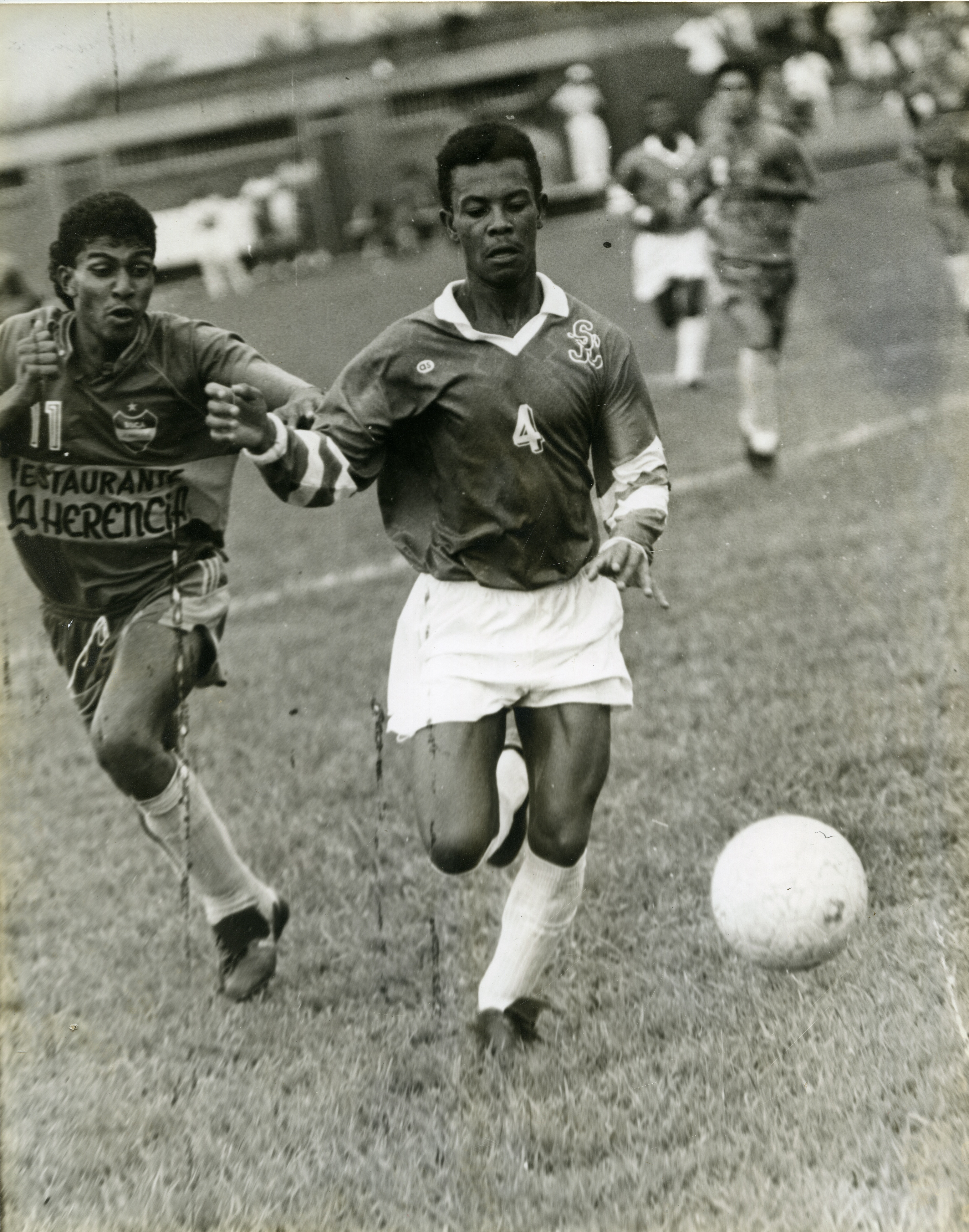En la gráfica partido entre los equipos Boca Juniors vs Sport Juventus, segunda división. Se aprecia dos jugadores corren tras balón