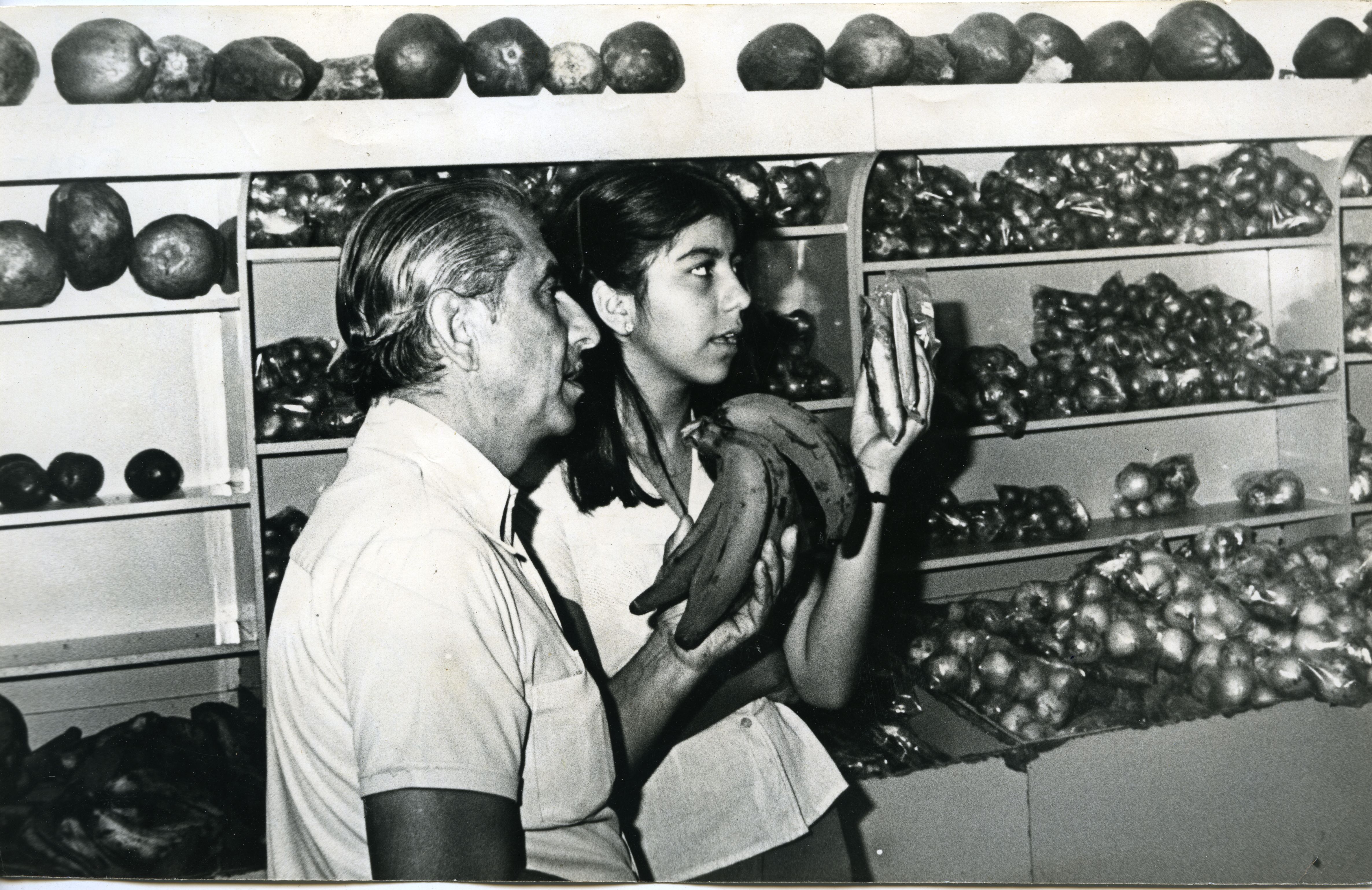 En la gráfica se observa un hombre y una mujer comprando plátanos y carne en una verdulería. Al fondo se observan estanterías con frutas y verduras.