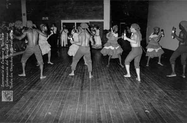 Grupo de danza de la Universidad del Valledirigido por Carmen López. Presentación de danza folclórica en uno de los auditorios. Cali. C. 1975.