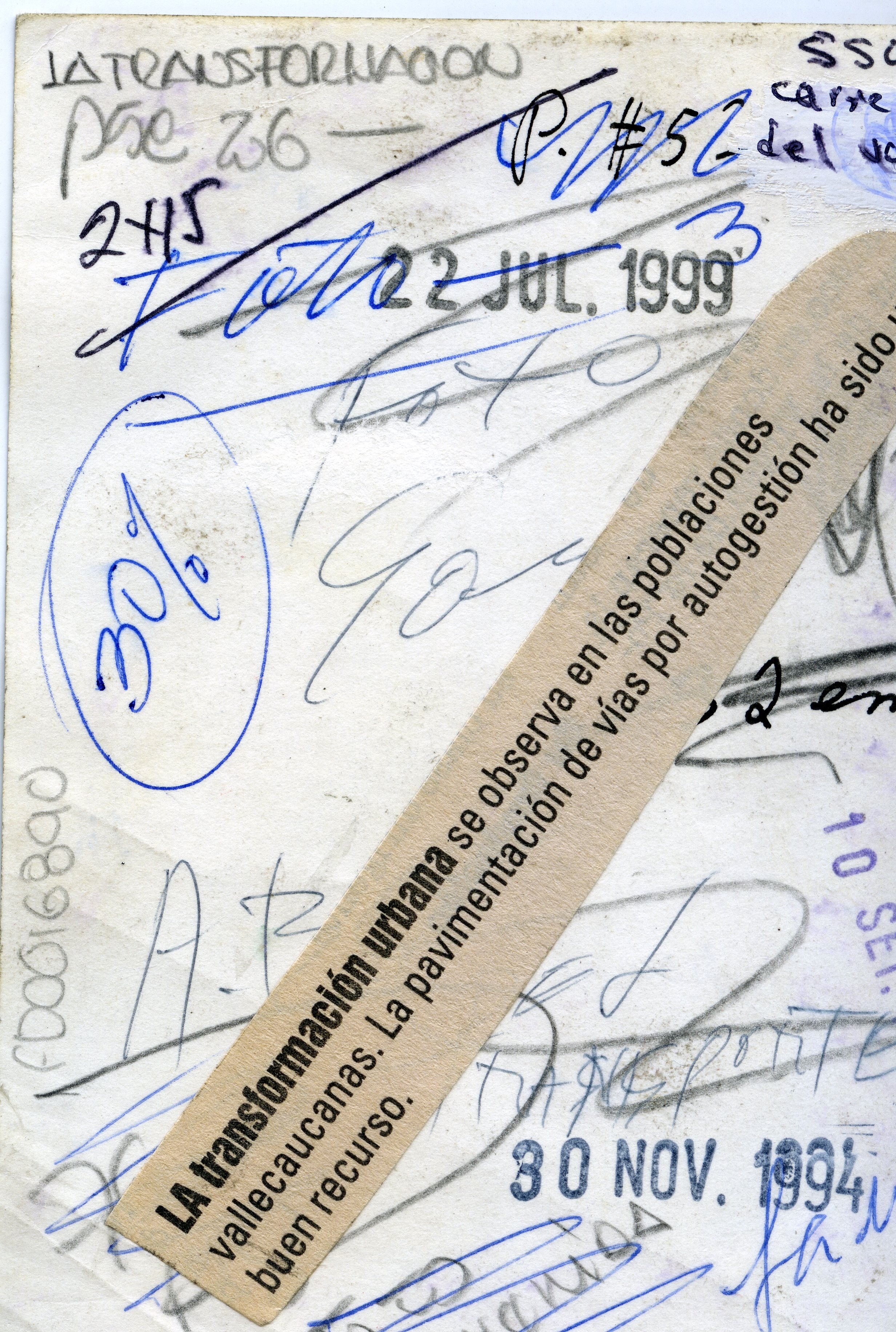 Al reverso de la fotografía se anexa recorte de prensa: "La transformación urbana se observa en las poblaciones vallecaucanas. La pavimentación de vías por autogestión ha sido buen recurso."