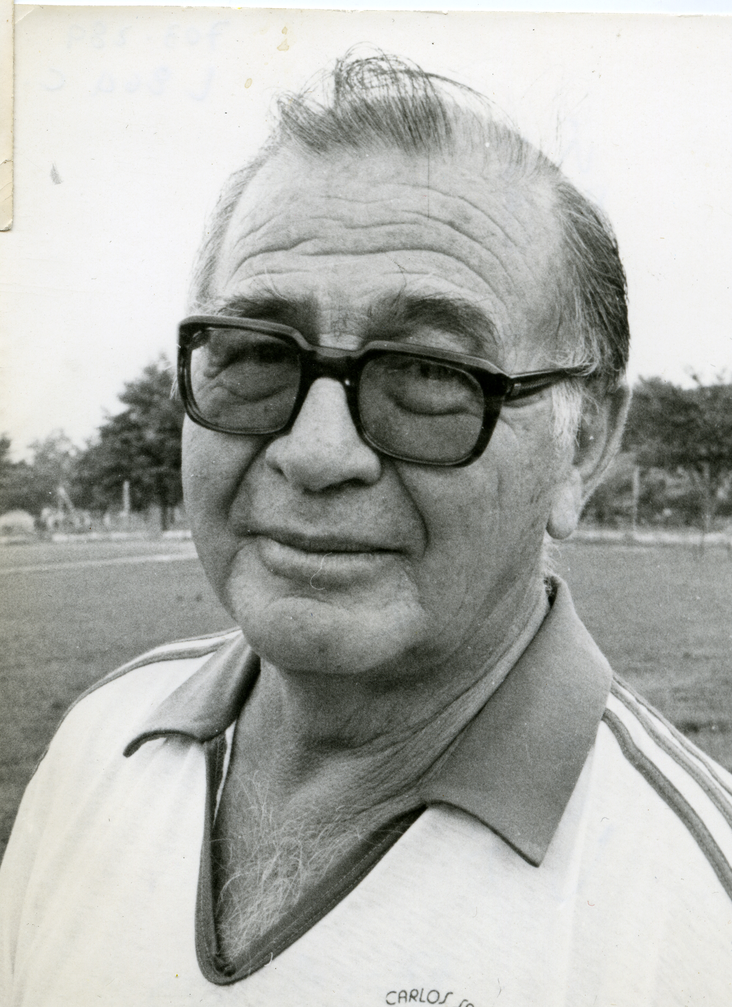 Fotografia de primer plano del tecnico de la categoria juvenil del Deportivo Cali, tiene buso manga corta.