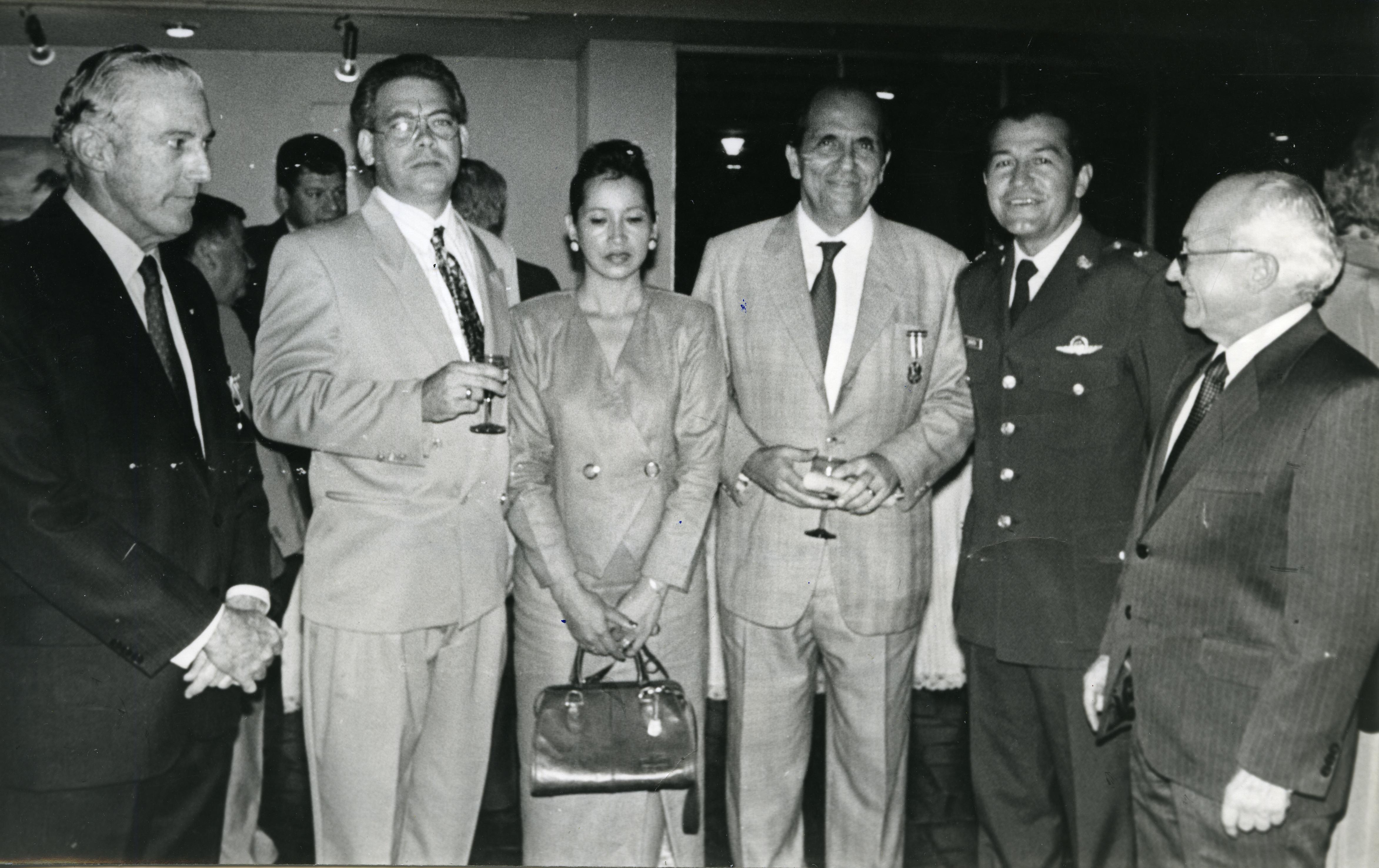 Reunión de gala, en la cual se distinguen 6 individuos, de entre los que se destaca un militar de alto grado.