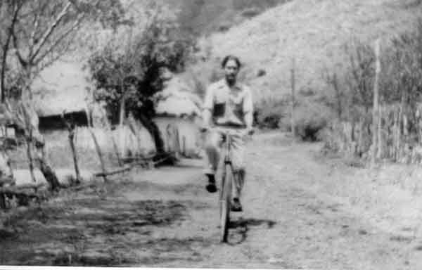 Ignacio Meñaca, de paseo en bicicleta. La bicicleta fue el medio de transporte más popular que se utilizaba para ir al trabajo, a los pueblos vecinos, hacer las compras, o ir a pasear con los amigos. Vijes, 1960.
