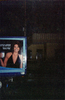 Plano medio. Poca iluminación. Imagen tomada con flash. En la imagen se destaca la imagen de una modelo en el furgón de una camioneta.
