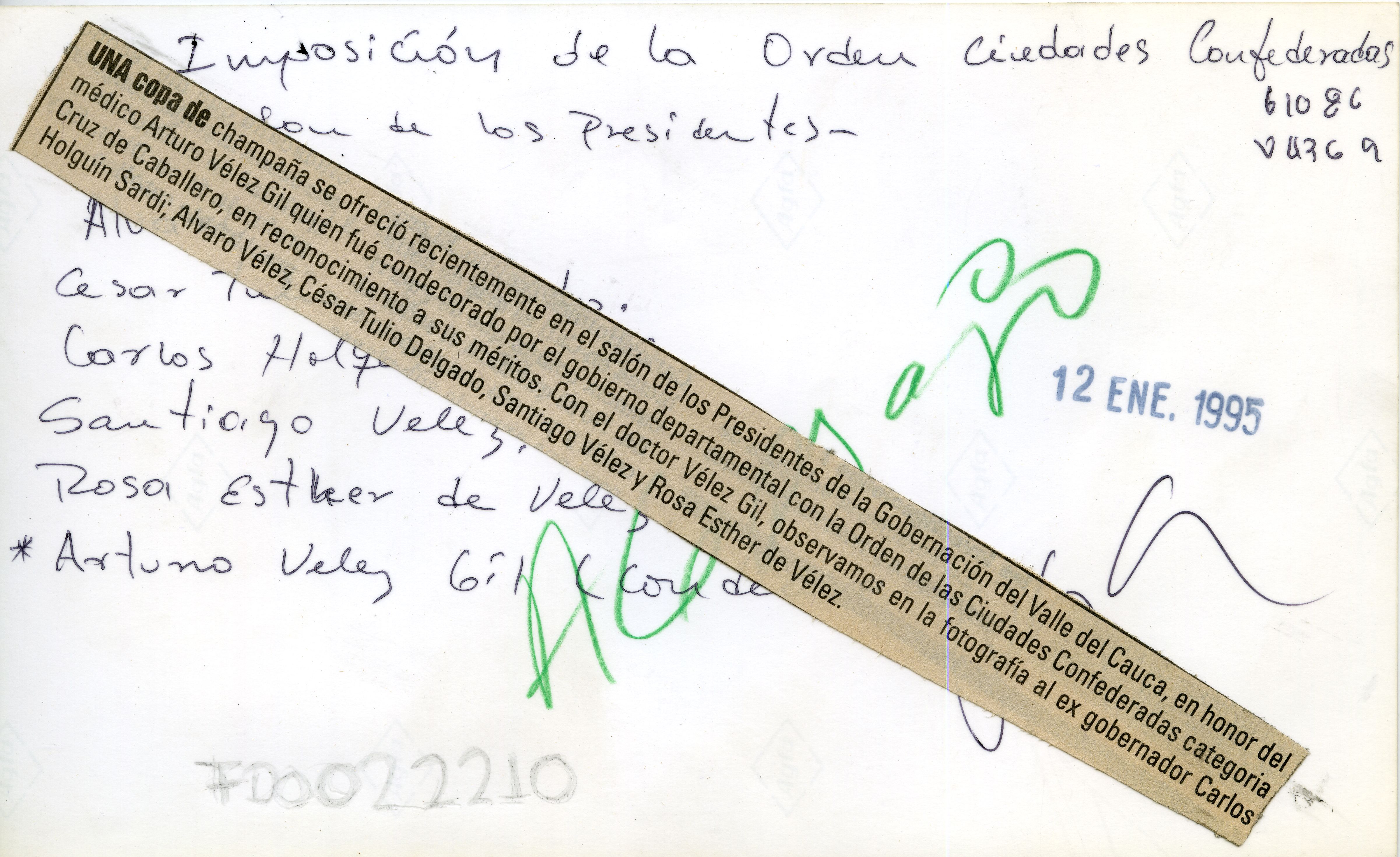 Al reverso de la fotografía se anexa recorte:" Una copa de champaña se ofrecio recientemente en el salon de los presidentes de la gobernación del Valle del Cauca en honor del médico Arturo Velez Gil quien fue condecorado por el gobierno departamental con la orden de ciudades confederadas categoria cruz de caballero, en reconocimiento a sus meritos. Con el doctor Vélez Gil, observamos en la fotografia al exgobernador Carlos Holguín Sardi; Álvaro Vélez, César Tulio Delgado, Santiago Velez y Rosa Esther de Velez