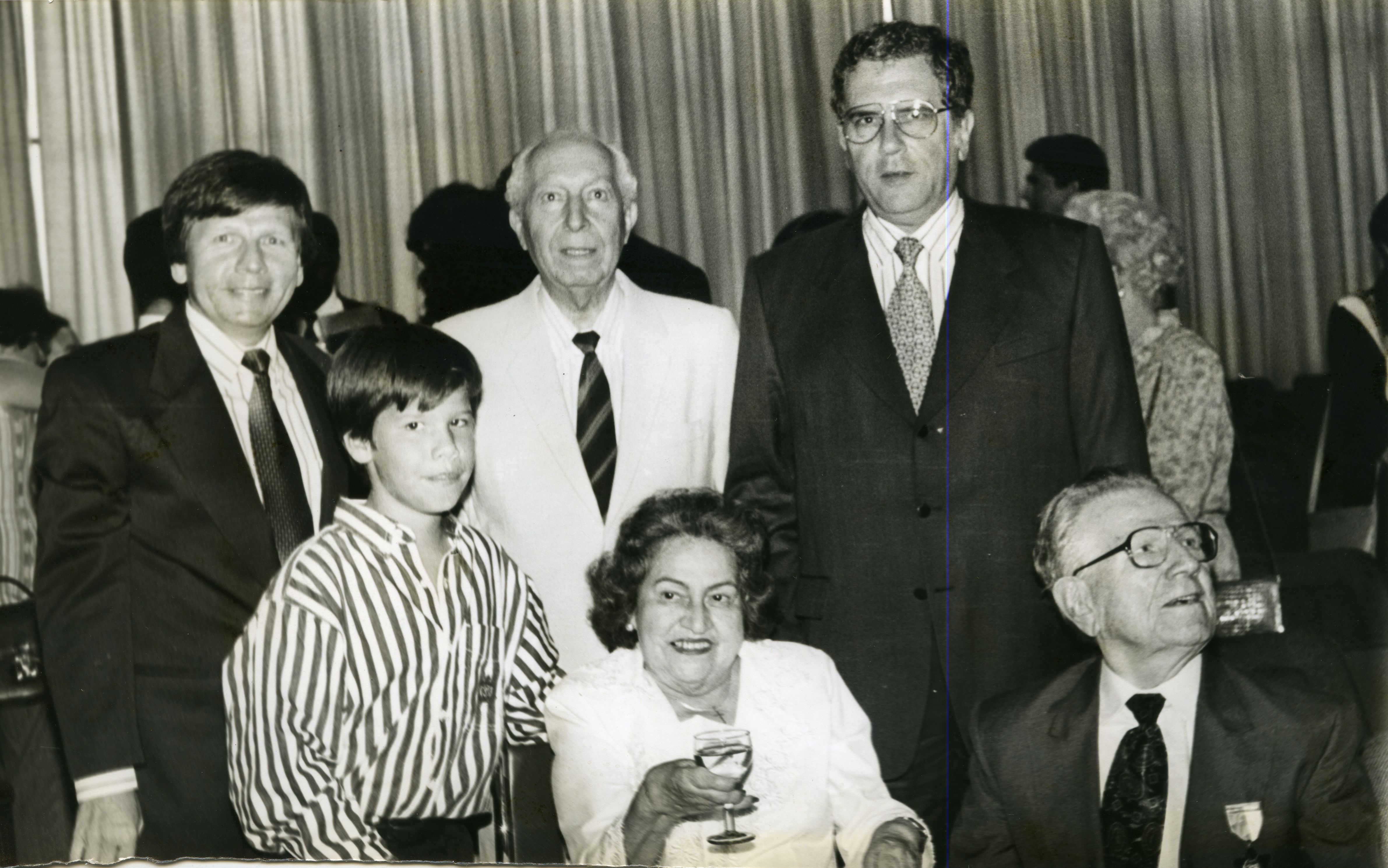 Fotografia de plano medio largo de Arturo Vélez Gil, donde se observa de pie con saco y corbata, a su lado se encuentran dos hombres y al frente se ven a una mujer que esta sentada y un niño