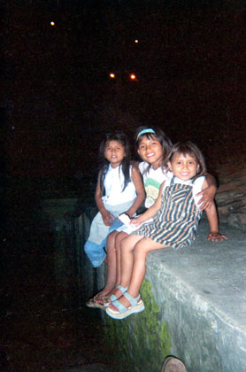 Plano medio. Toma realizada de noche, con luz de flash. Donde se aprecia la puesta en escena de un grupo de tres niñas sentadas sobre un muro de concreto.