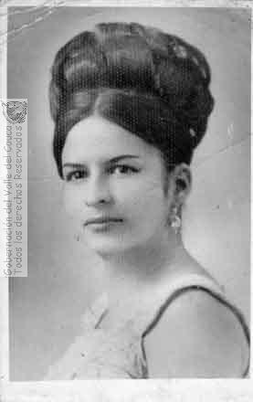 Señorita Gladis Satizabal Reyes. Ginebra. 1971. Entre los peinados de la década se destacó el uso de grandes moñas con bucles enlacados.