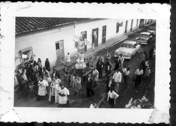 Desfile por la calle del Camellón. Encabezan el desfile las autoridades eclesiásticas. Bolívar, 1955