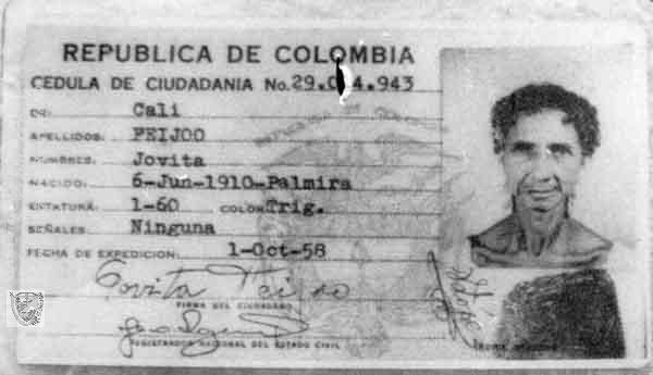 Cédula de ciudadanía de Jovita Feijoo. Personaje querido y recordado por la sociedad de Santiago de Cali, C. 1.970