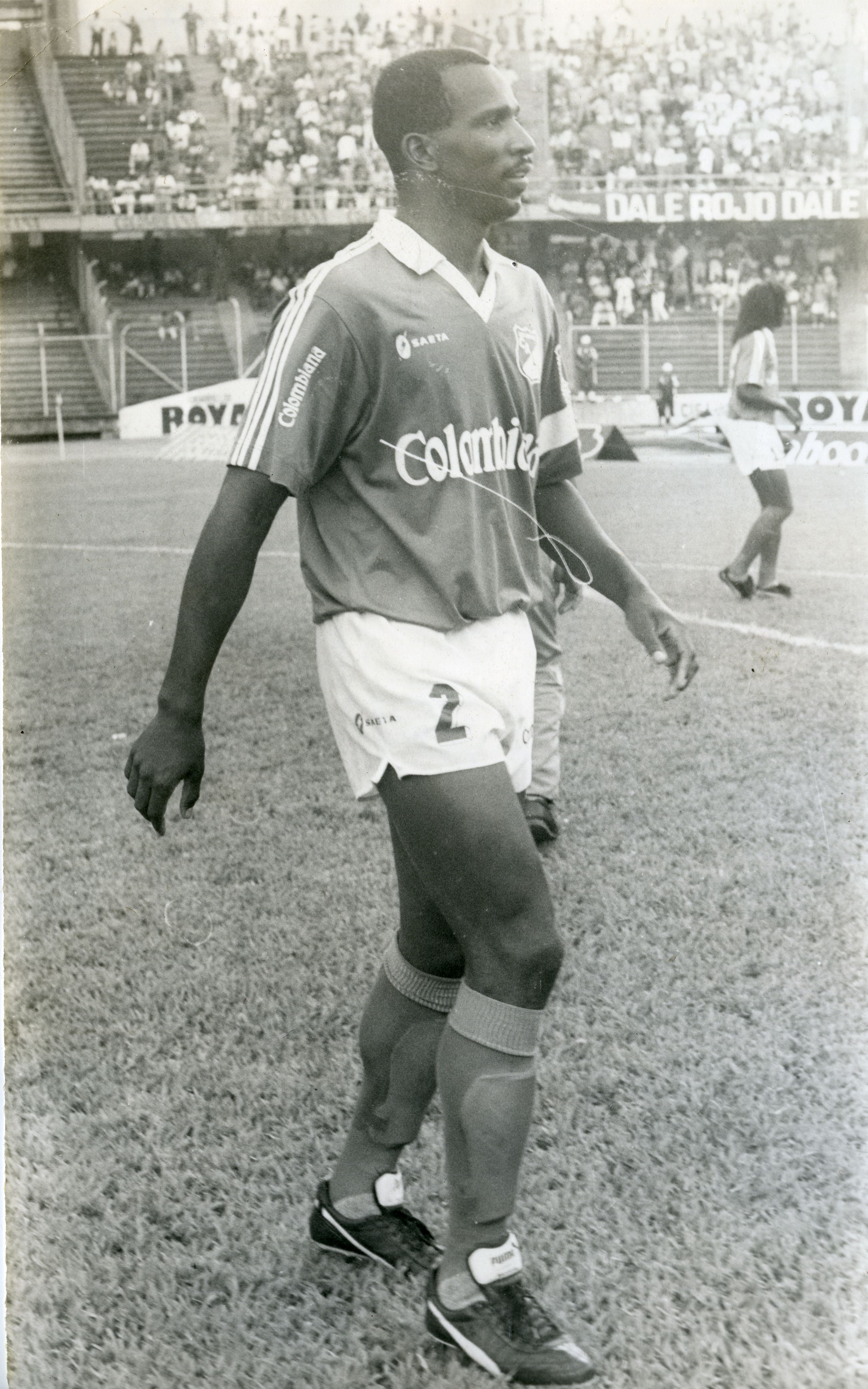 Deportivo Cali, club de fútbol colombiano del Valle del Cauca de la ciudad de Santiago de Cali, Sus inicios se remontan al 23 de noviembre de 1912 y posteriormente ha participado del fútbol profesional desde el año 1948 en donde ha obtenido 10 títulos como campeón del torneo colombiano al 2021, Campeón Copa Colombia 2010, Campeón Superliga de Colombia 2014, ha sido dos veces finalista de la Copa Libertadores de América. Jorge Eliecer Ambuila Rodríguez, jugador del Deportivo Cali. Se aprecia al jugador en la cancha del Pascual Guerrero. Observamos público en la tribuna