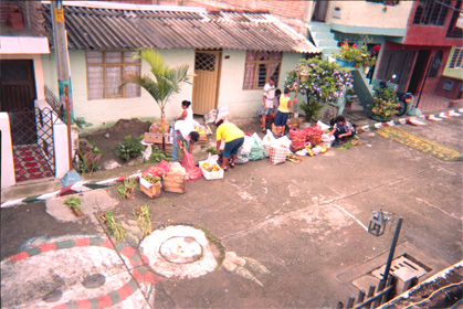 Niño Jiménez, B. E. (2005). Plano general en picado de un antejardín donde prima el cemento y se desarrolla un día de mercado movil. Santiago de Cali: Biblioteca Departamental Jorge Garces Borrero.