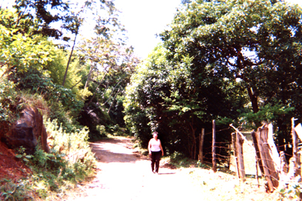 Plano general. Sendero campestre rodeado de frondosa vegetación por el que transita una mujer mirando de frente. Brilla el sol.