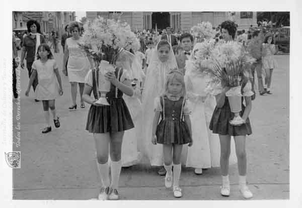 Desfile de niñas que hacían la primera comunión en la iglesia de San Nicolás. Cali. C. 1970