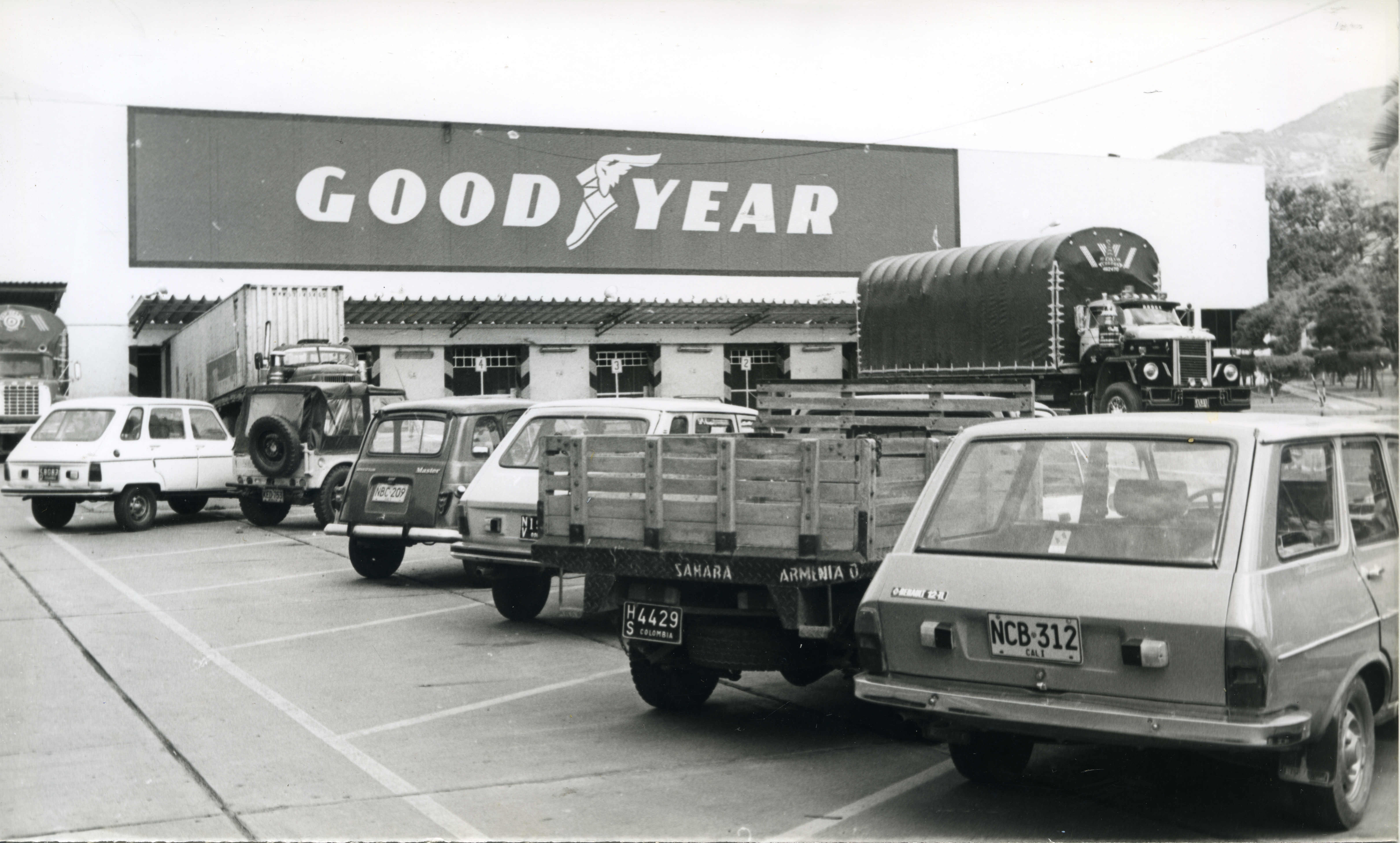 Vista desde el parqueadero de la fábrica de Goodyear. Se ven varios carros estacionados y al fondo el logo de la empresa.