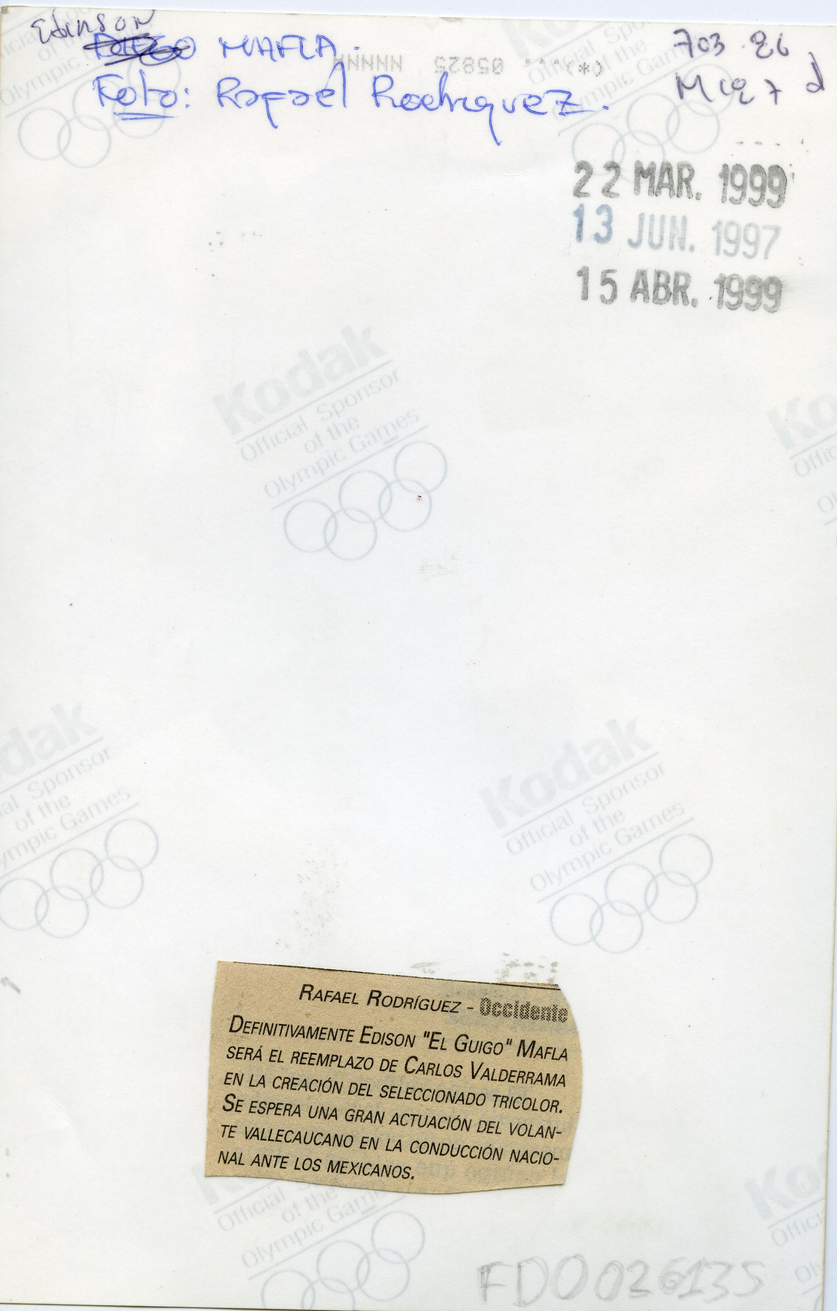 Reverso: Rafael Rodríguez de Occidente. Definitivamente Edinson El Guigo Mafla sera el reemplazo de Carlos Valderrama en la creación del seleccionado tricolor. Se espera una gran actuación del volante vallecaucano en la conducción nacional ante los Mexicanos