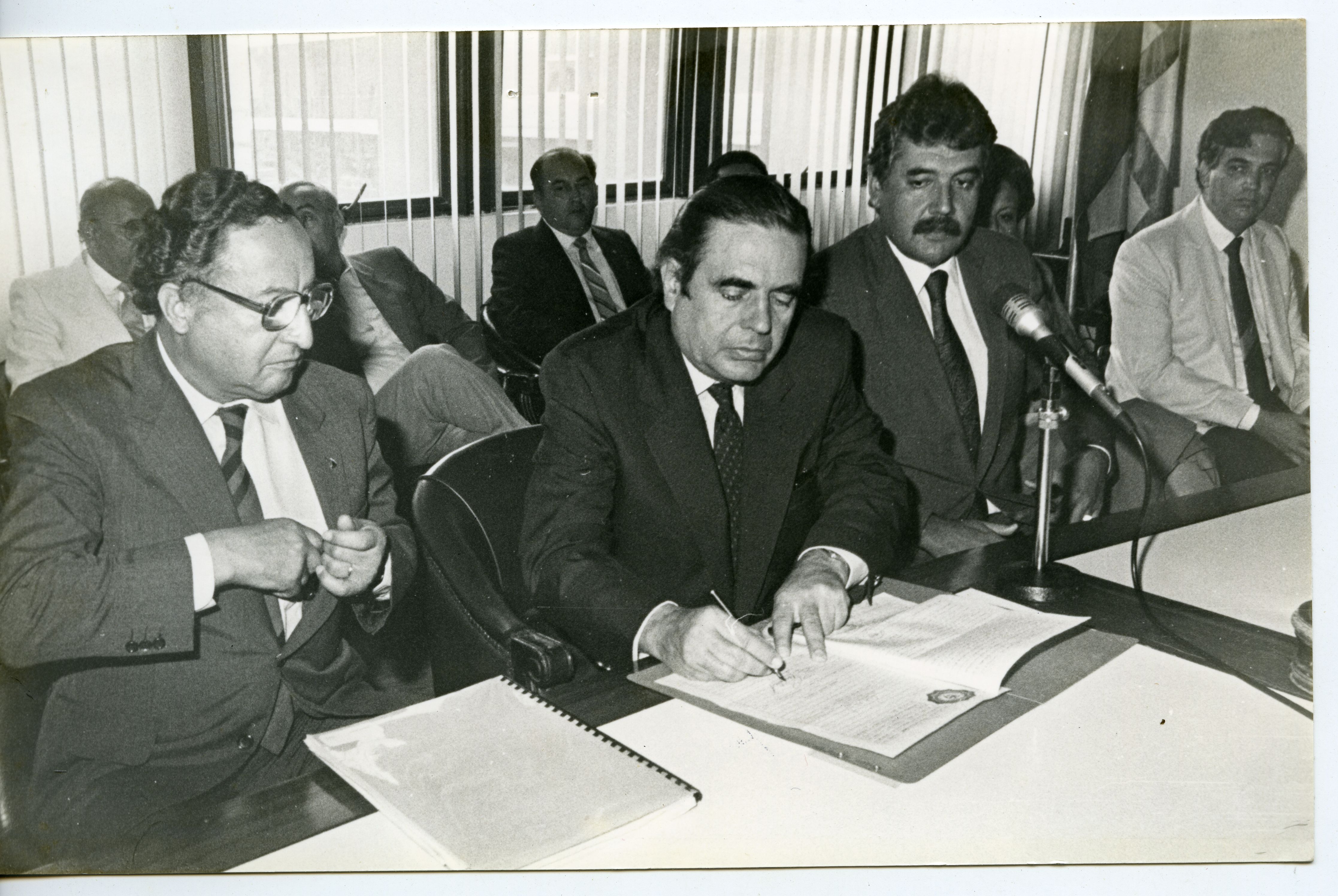en la fotografía se detalla a Ernesto González en compañía de otros funcionarios, quienes se encuentra dentro de un recinto cerrado, El gobernado esta firmando un documento