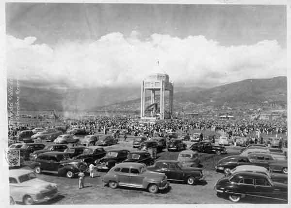 Congreso Eucarístico Bolivariano, El Templete. Alrededor los automóviles clásicos de la Época. Santiago de Cali, 1948.
