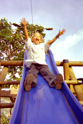 Plano Medio, Contra picado. Un tobogán azul dibuja una línea vertical y en la parte superior un niño con los brazos elevados se desliza por el. Al fondo una estructura en madera,