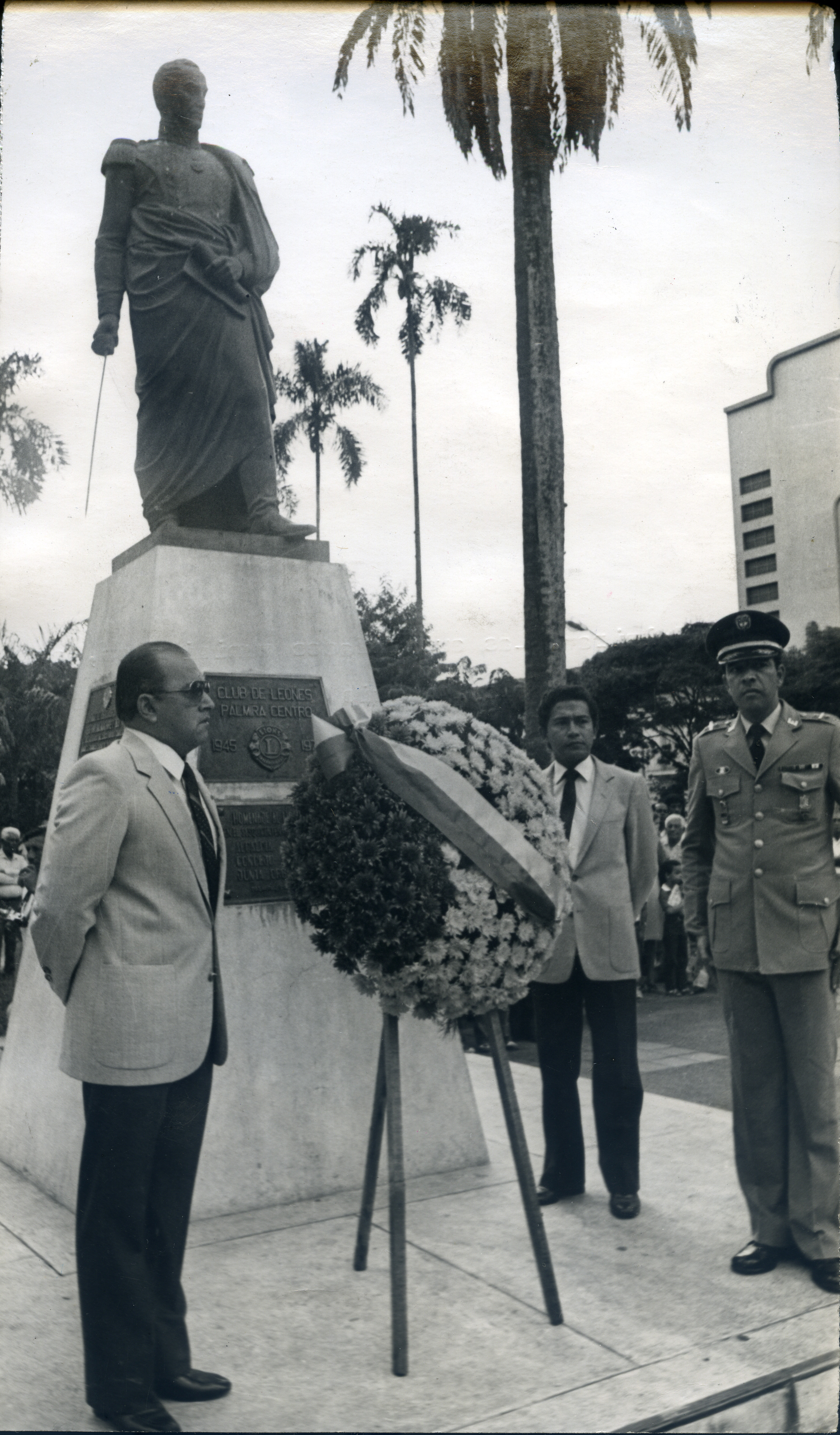 Información al reverso: Las autoridades municipales, con el alcalde Luis Eduardo Sanguino Soto a la cabeza, rindieron honores al Libertador Simón Bolivar con una ofrenda floral en el parque que lleva su nombre, con ocasión de la recientes fiestas patrias del 20 de Julio. En la gráfica aparecen además del jefe de la administración local, el secretario e Gobierno Luis Eduardo Mendoza García y el comandante del Batallón Codazzi, coronel Jesús MAría Iguarán.