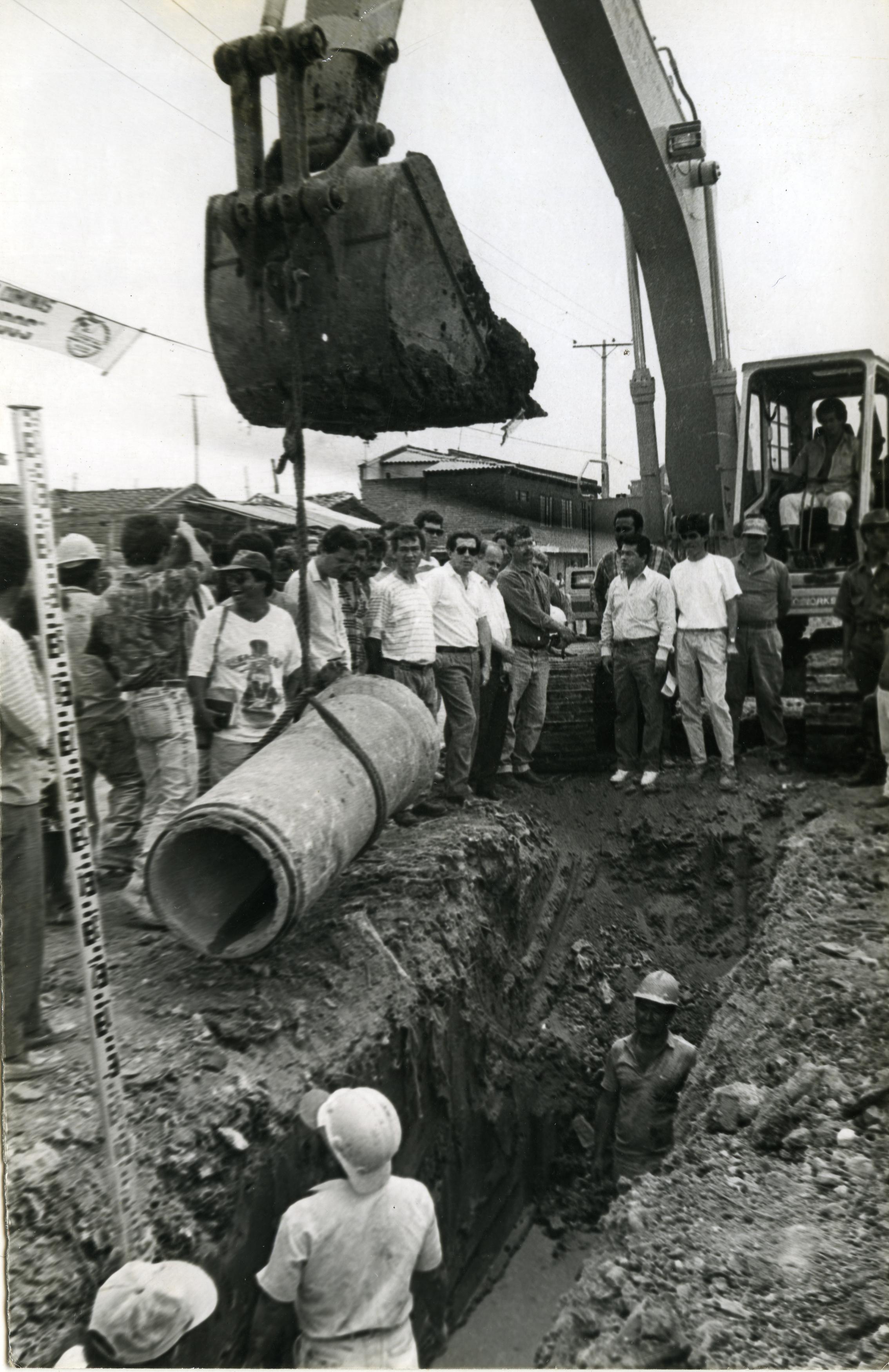 En la gráfica se observa la instalación de tubos de alcantarillado en. Se observa el espacio donde se sería instalado, la maquinaria utilizada, algunos obreros y algunas personas al rededor observando.