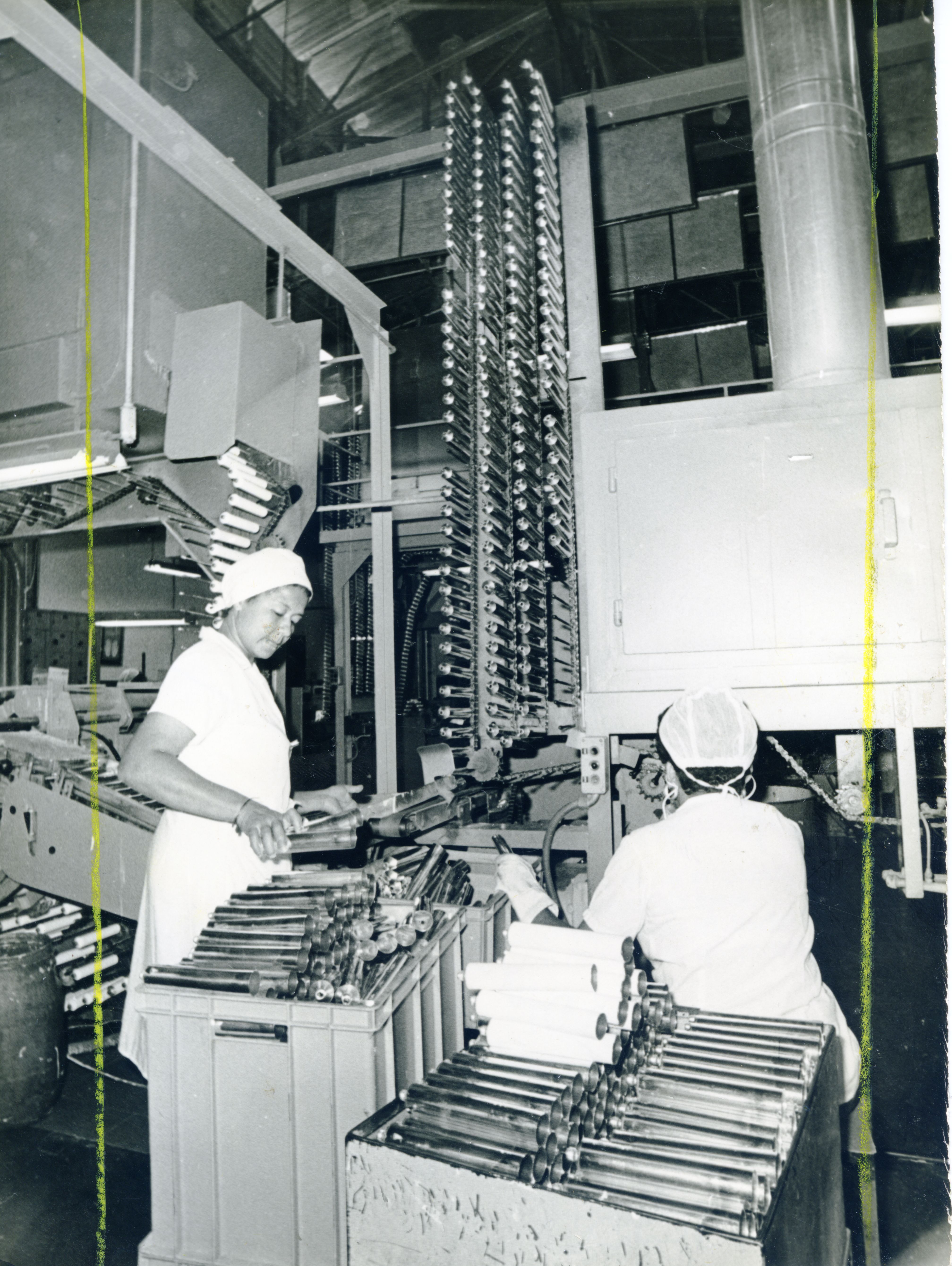 Al reverso de la fotografía se anexa recorte: "Operarias entrenadas por la empresa supervisan paso a paso los procesos de los tubos"