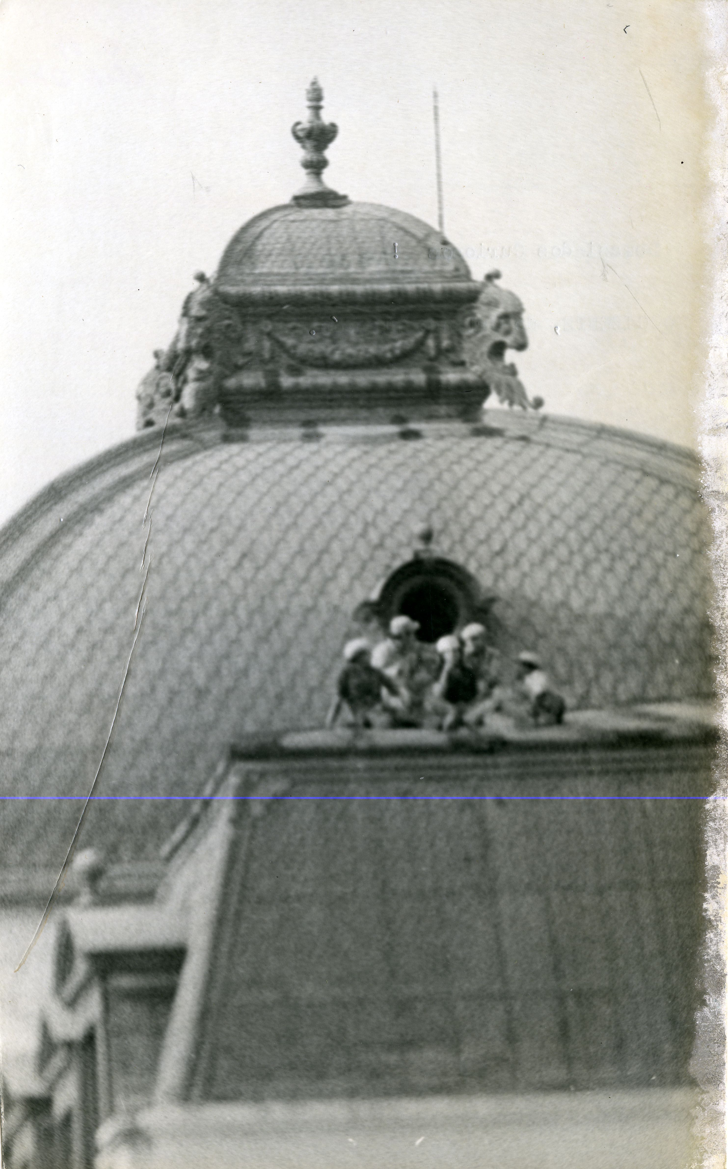 Fotografia de plano completo de la cupula del edificio Otero, donde se observan a cinco trabajadores en la cuspide de el edificio Otero