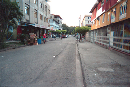 Plano general. En primer plano perspectiva de piso. Punto de fuga al fondo de la imagen. En los externos edificaciones. Sujetos en el plano medio en la vía. Al fondo vegetación.