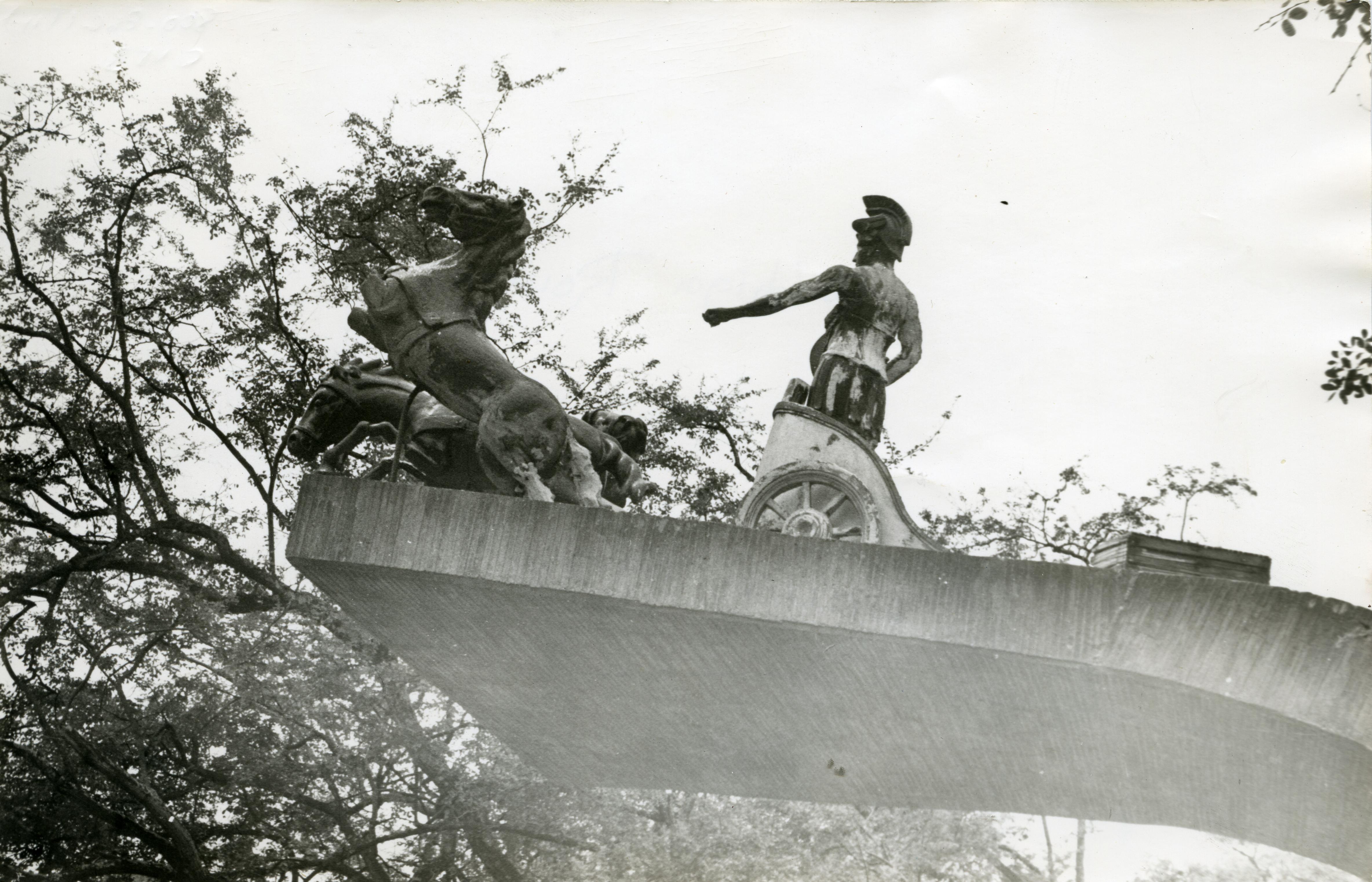 En la gráfica se aprecia: Ubicado en la Avenida Colombia con calle 4a Oeste. Es una Cuadriga Romana "carruaje alado por caballos utilizados para el combate", la cual está sobre una estructura de ferro concreto en forma de obelisco, de allí su nombre, este fue construido en el año de 1926 por el escultor Juan Fisher. Corría en Cali, la época de los años veinte cuando el concejal diputado Juan B Quintero de origen Santandereano pero radicado en Cali, decidió traer desde España al escultor Juan Fisher con el objeto que le construyera un monumento como homenaje al progreso de Cali, al que llamó La Cuadriga Romana. La escultura tenía su armazón en hierro forrado en cemento y yeso con pintura dorada, una vez terminada fue colocada en la azotea de su casa ubicada en la carrera 4a con calle 15. Con el correr del tiempo no había caleño que no identificara el lugar como la calle de los caballos. Antes de morir el señor Quintero, deseó que el monumento fuese donado a la ciudad de Cali, y fue así como sus hijos para cumplir su voluntad lo entregaron a la ciudad a través de la Sociedad de Mejoras Públicas. La cuadriga fue restaurada y ubicada en el sitio del obelisco e inaugurada el 11 de diciembre del año 1990.
