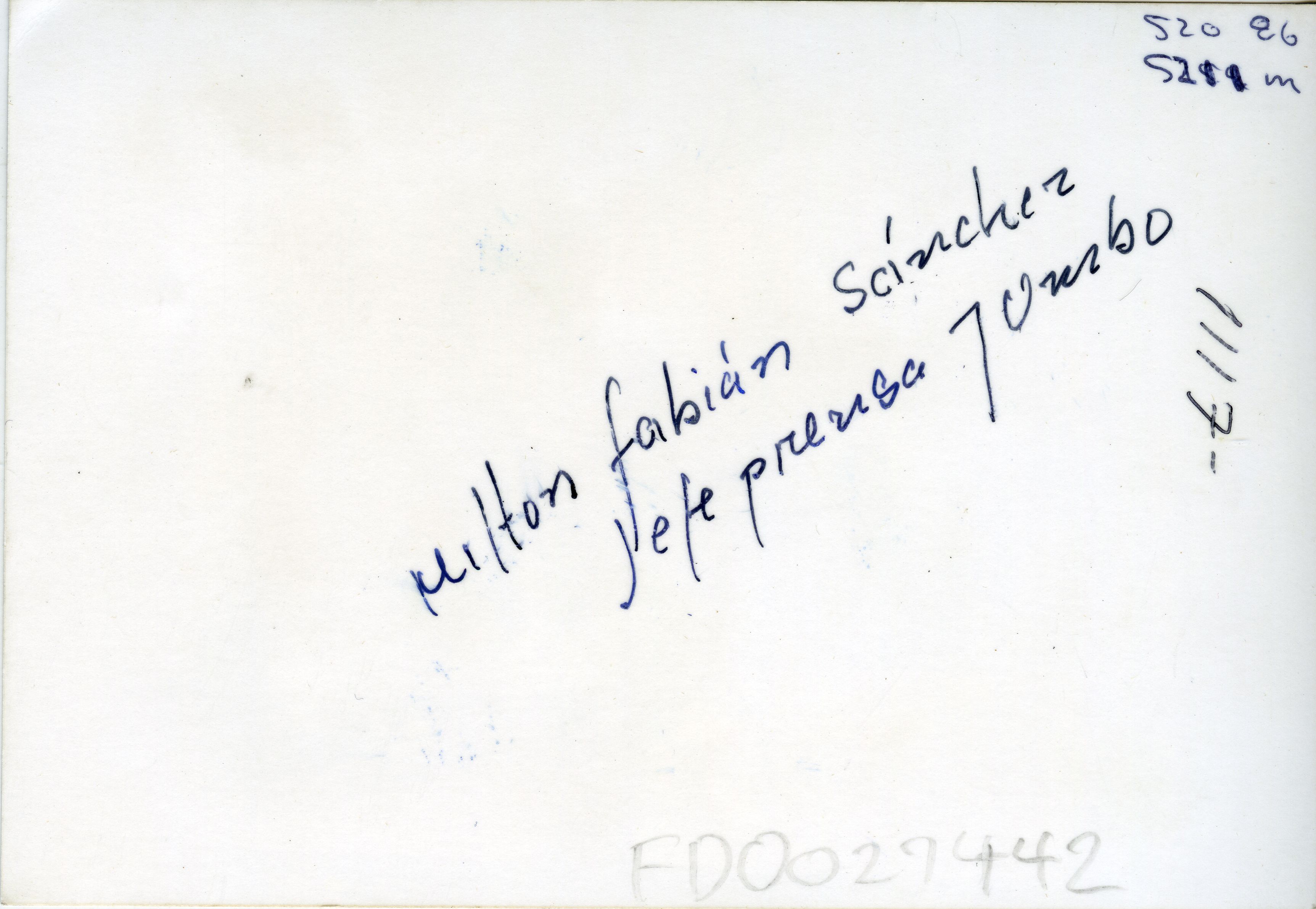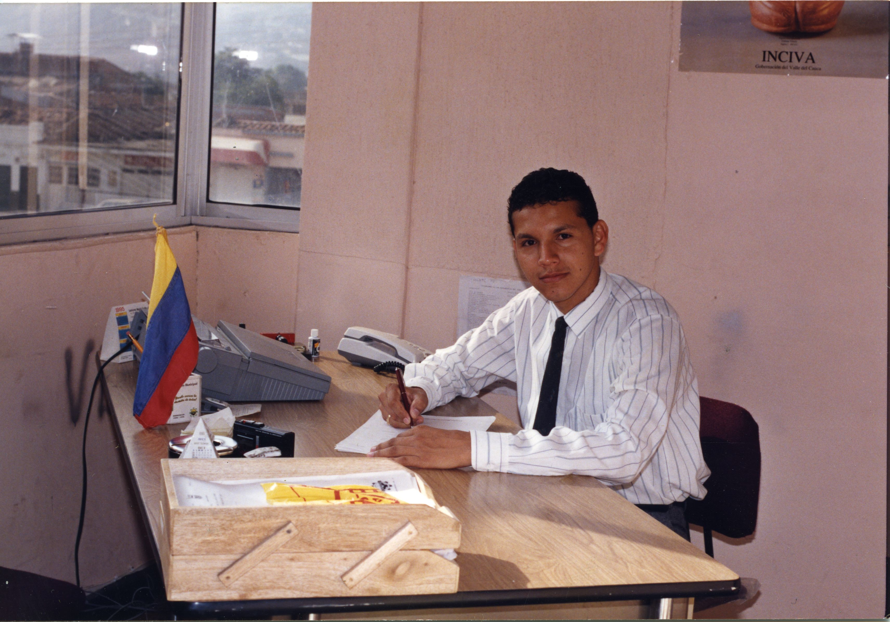 Retrato de Miltón Fabián Sánchez, jefe de prensa de Yumbo, sentado en un escritorio firmando papeles.