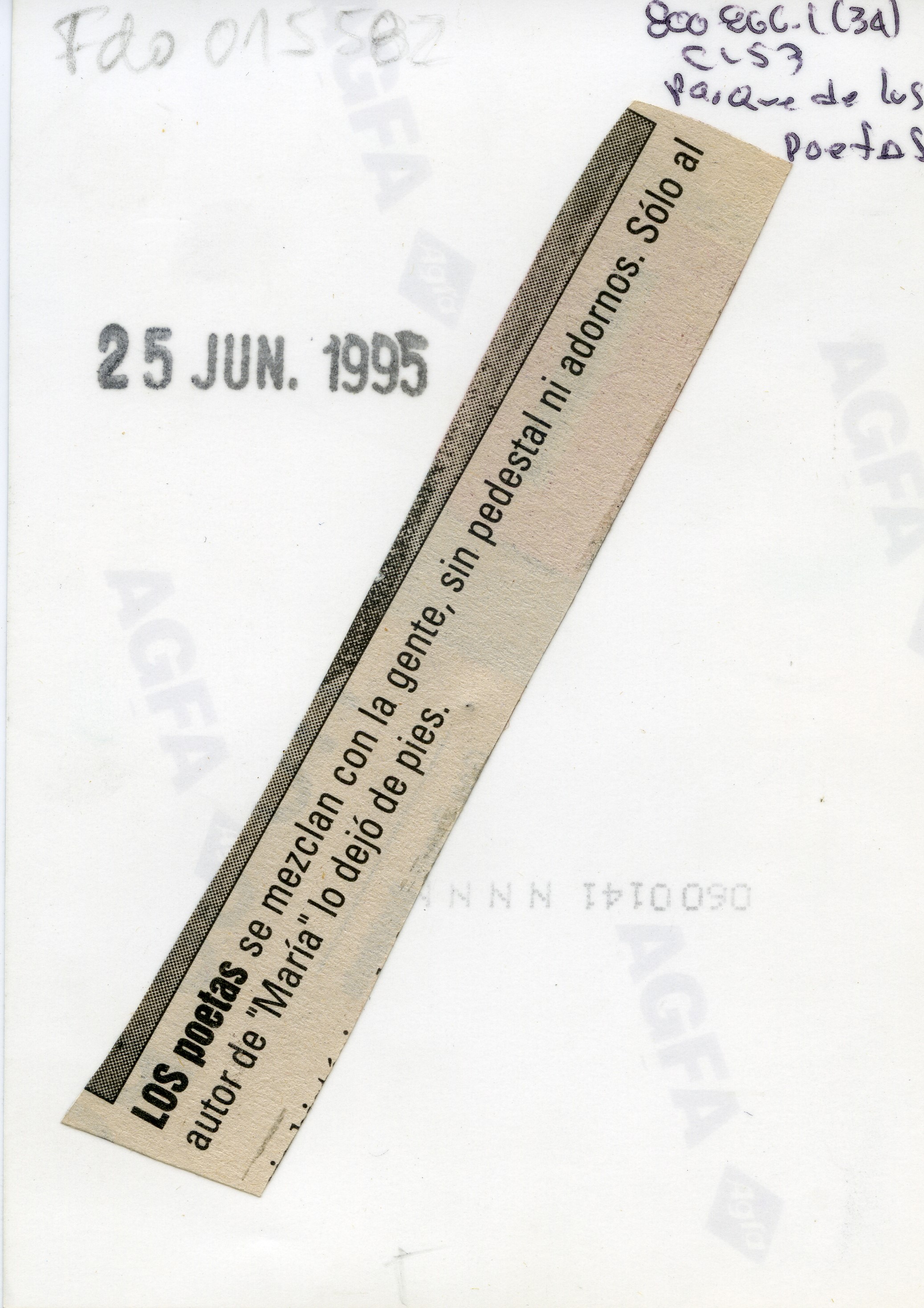 Al reverso de la fotografía se anexa un recorte: " LOS poetas se mezclan con la gente, sin pedestal ni adornos. Sólo al autor de "María" lo dejó de pies."