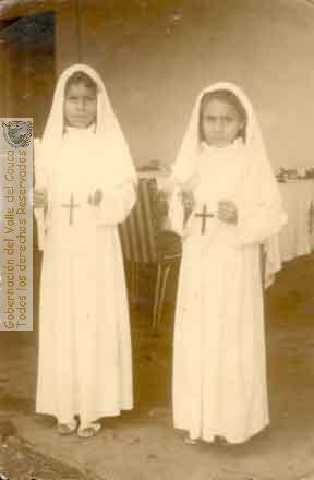 Las hermana Amilbia y Edith Escobar celebrando la primera comunión con vestidos de hábito religioso en representación de la virgen María. Guacarí. 1964.