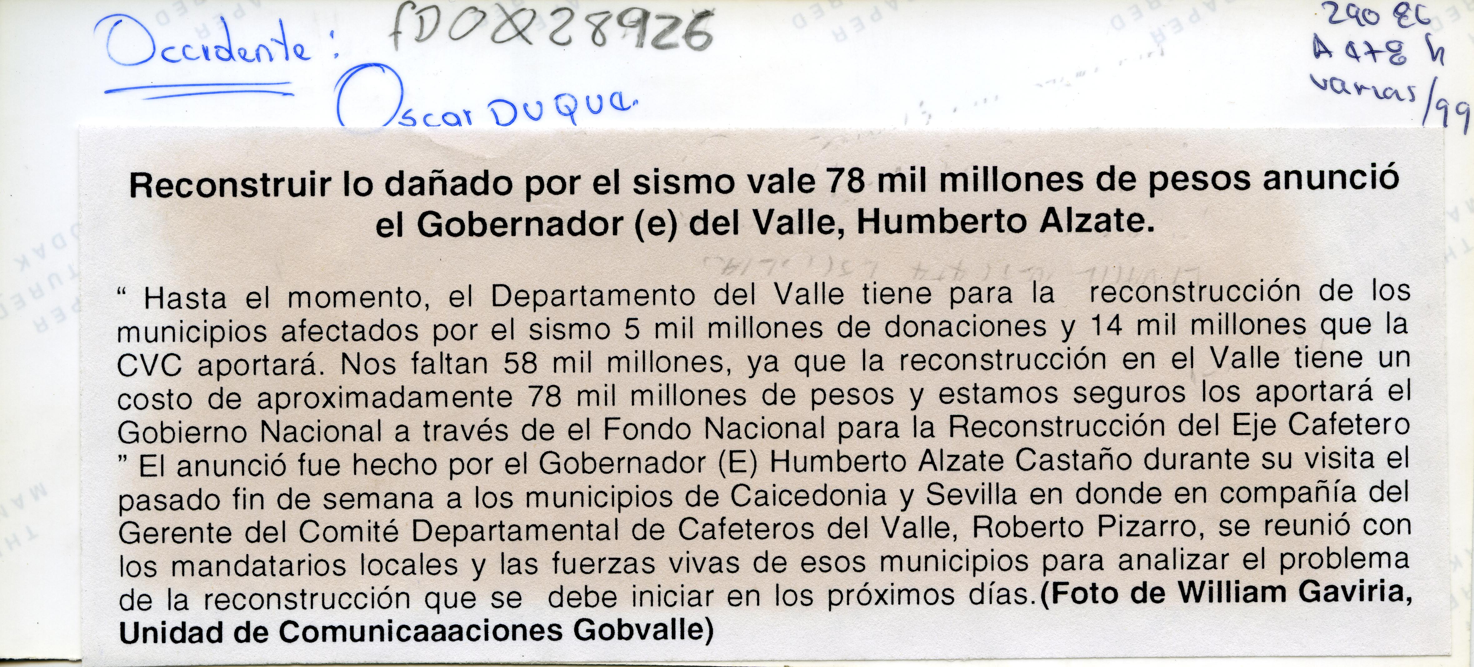 | dc.description.abstract | Reverso" Reconstruir lo dañado por el sismo vale 78 millones de pesos anunció el gobernador del Valle, Humberto Alzate. Hasta el momento, el departamento del valle tiene para la reconstrucción de los municipios afectados por el sismo 5 mil millones de donación y 14 mil millones que la CVC aportará. Nos faltan 58 mil millones de donaciones en el Valle tiene un costo de aproximadamente 78 mil millones y estamos seguros los aportará el gobierno nacional a través del fondo nacional para la reconstrucción del Eje cafetero- El anuncio fue hecho por el gobernador Humberto Alzate Casataño durante su visita el pasado fin de semana a los municipios de Caicedonia y Sevilla en donde en compañía del gerente del comité departamental de cafeteros del valle, Roberto Pizarro, se reunió con los mandatarios locales y las fuerzas vivas de esos municipios para analizar el problema de la reconstrucción que se debe iniciar en los próximos días". | spa |
