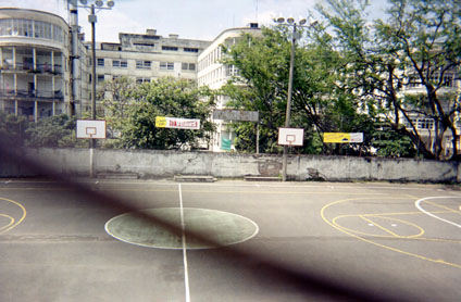 Escenario deportivo en franja inferior. Exterior día. Perspectiva de edificio de fondo. Vegetación en centro superior. Realce de formas circulares en primer plano.
