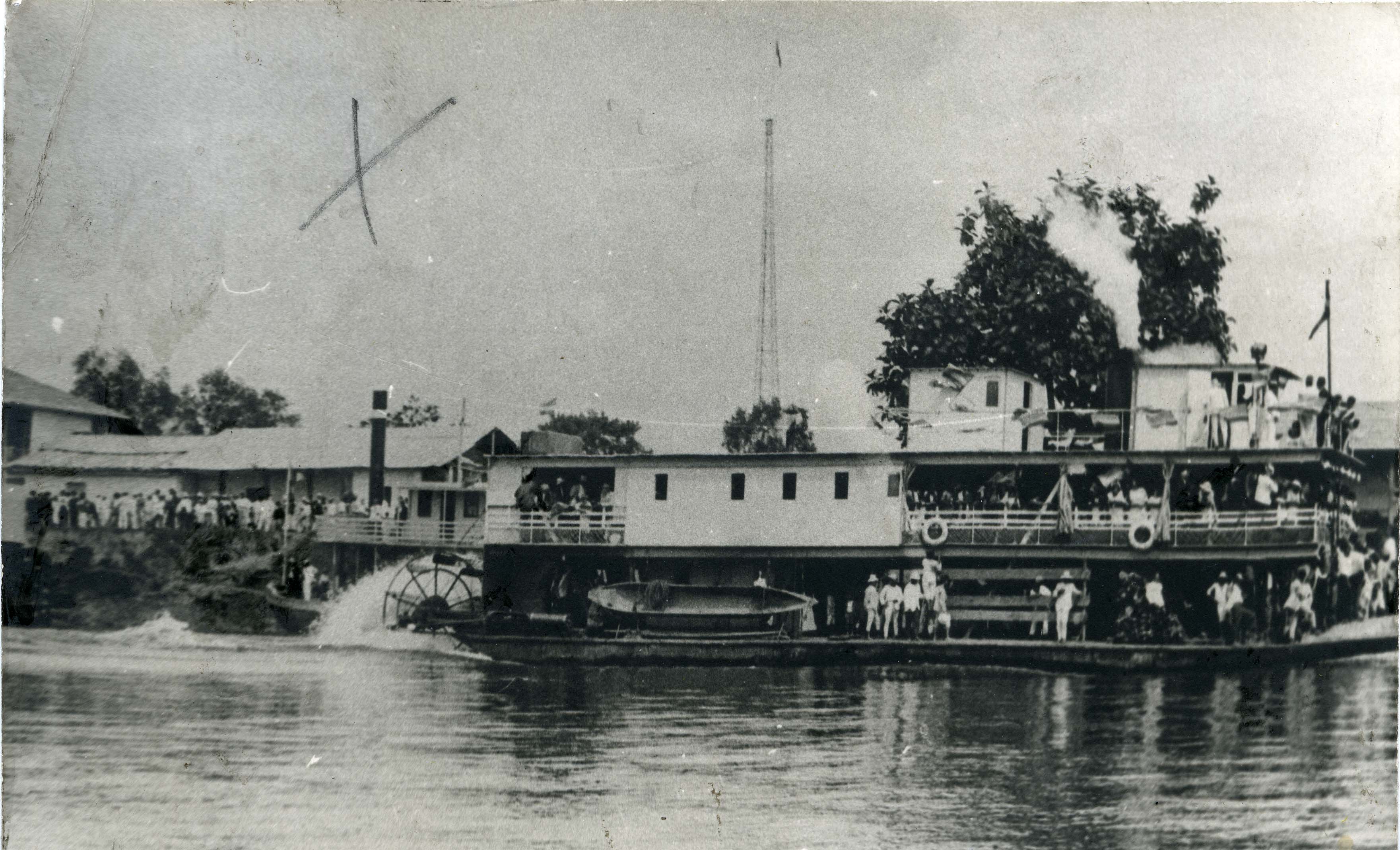 En el pie de foto dice lo siguiente: Cali, “Juanchito”, vapor cabal en el Rio Cauca, dedicado al Transporte fluvial en el Valle del Cauca. observamos el barco de dos pisos y con bastante personas