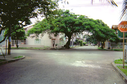 Plano general. Se puede apreciar el cruce de dos vías pavimentadas y al fondo la fachada de algunas viviendas. Junto a ellas algunos árboles frondosos.
