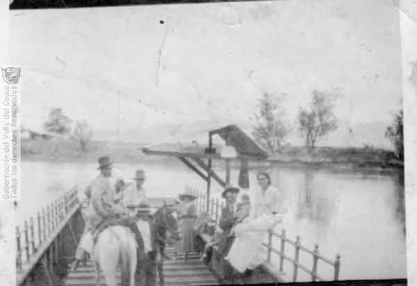 Habitantes de Trujillo en el paso de la barca en el río Cauca. Estas embarcaciones están construidas en hierro y tienen en el piso un tendido de tabla. Funcionan con poleas y utilizan la fuerza del agua para su esplazamiento. Trujillo. C. 1935.