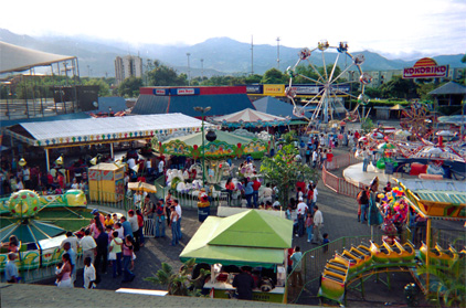 Plano general. En la imagen atracciones mecánicas en el centro comercial La 14. En el plano medio edificaciones al fondo farallones de Cali.