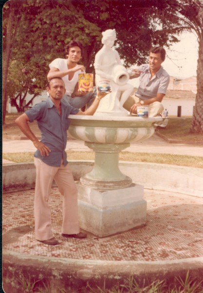 Pileta del parque con la escultura de la aguadora, junto a ella: Osver Vásquez, Oscar Villafañe y Gloria Villafañe. Zarzal, 1978.