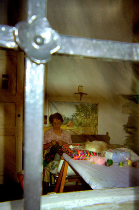 Plano Medio. En un primer plano se observa un fragmento de una reja en forma de cruz con un rosetón en la intersección de la misma. Al fondo en el interior de la habitación una mujer sentada realiza el oficio de la sastrería, también se observan herramientas de trabajo y elementos decorativos. Las condiciones de luz son escasas.