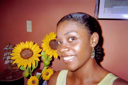 Primer Plano. Imagen tomada en el interior de una vivienda, con luz de flash, donde se destaca el rostro de una mujer joven con una expresión de alegría en su rostro. Al fondo cuatro girasoles en madera contrastan con un muro de color salmón.