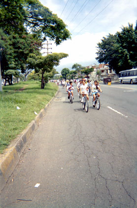 Plano contextual. Exterior día. Ciclovía. Perspectiva lineal. Sujetos en toma frontal y enfoque central. Contraste de textura agrietada de calle sobre textura linear de prado.