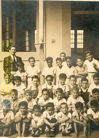 Estudiantes de la escuela Isaías Gamboa en el barrio El Peñón. Se aprecian entre otros, al profesor Jorge Escobar y los alumnos, Carlos Arturo Gamboa, Daniel Arizabaleta y Alier Quilice. Cali, C. 1948.
